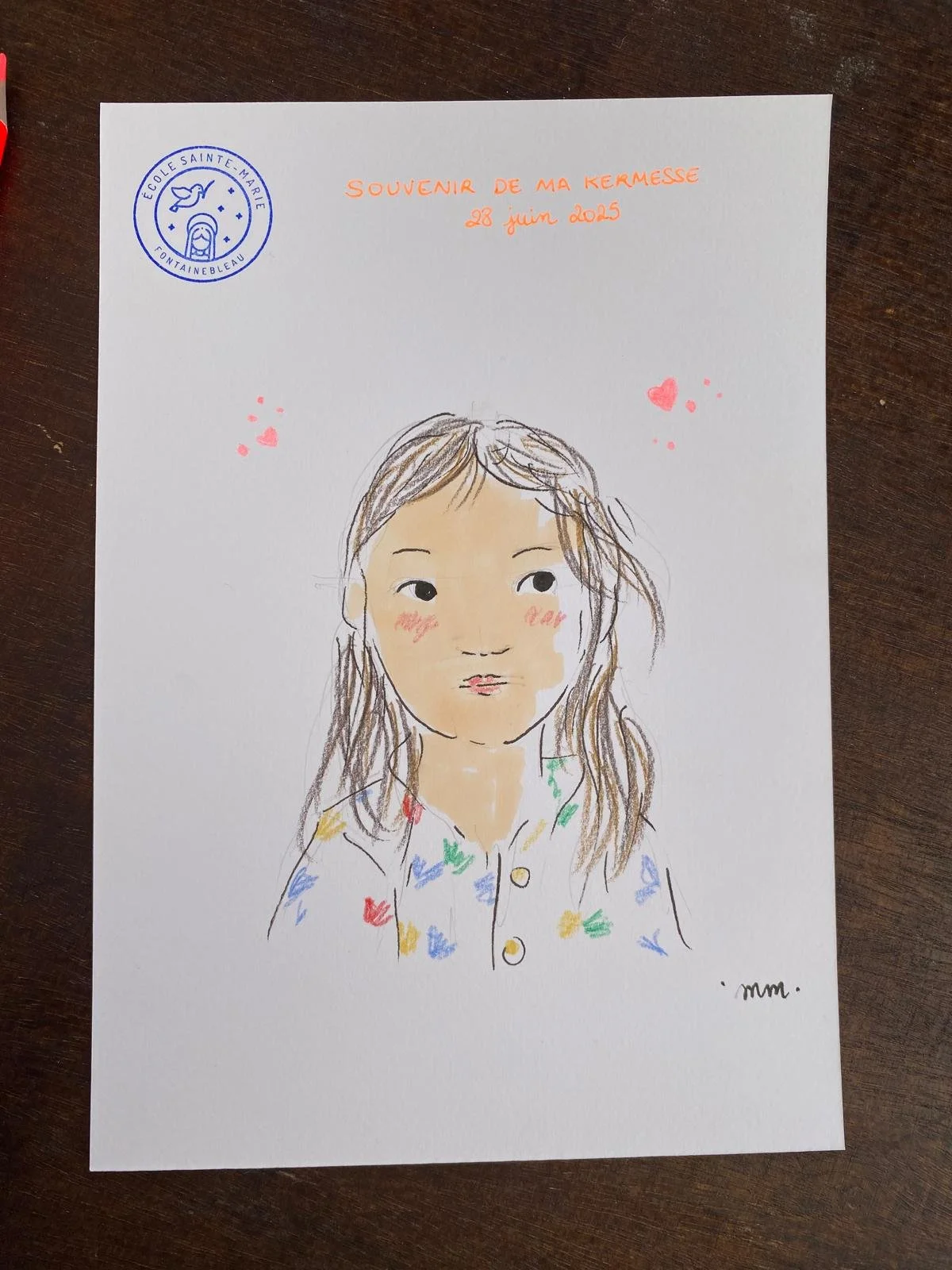 Pendant l’événement : vous fournissez une table et deux chaises, j’apporte tout le matériel, vos invités prennent la pose quelques minutes et repartent avec leur portrait.
